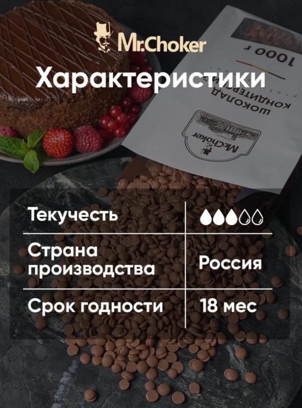 Натуральный кондитерский шоколад в каплях бренда Мистер Чо - идеальный ингредиент для создания вкусной выпечки и сладких десертов. Элитный товар выпускается специально для кондитерских мастеров, которые ценят высокое качество продуктов. Добавьте его в свои рецепты и создавайте уникальные праздничные десерты для своих близких и коллег. Каждый кусочек этого лакомства - это восхитительное вкусное угощение, которое подарит незабываемую радость. Упаковка в 1000 г позволяет использовать его для создания больших тортов и сладких композиций. Также можно приобрести несколько пакетов по 1 кг. Наш продукт подарит вам вдохновение и позволит проявить все мастерство. Настоящий шоколад в каплях можно использовать для приготовления глазури для пирожных, ганаша для выравнивания торта или начинки, а также замесить кусочки в тесто кексов, печенья. Кроме того, он позволяет сделать оригинальные и необычные интересные фигурки и украшения любых форм и даже цветы для тортов и других десертов. Вы сможете даже приготовить и украсить свадебный торт или растопить капельки и создать шоколадный фонтан для вечеринки или праздника. На основе пищевого продукта можно готовить, а также другие сладости. А еще продукт можно есть просто так с чаем и кофе или другими напитками. Вкус понравится девочкам и мальчикам, подросткам и даже взрослым. Вы сможете дарить кондитерские изделия ручного изготовления знакомым мужчинам и женщинам. Порадуйте подарочным набором конфет собственного приготовления маму, папу, бабушку, дедушку, сестру, брата или другого родственника на Новый год, свадьбу и другой праздник. Сделайте особенный сюрприз любимой девушке или парню или угостите домашними вкусняшками лучшую подругу, воспитателя и школьного учителя. Подарок, сделанный своими руками, лучше всего покажет вашу любовь. Содержание масла какао 30%. Это обеспечивает яркий вкус и интенсивный нежный аромат продукта. Он хорошо плавится, поэтому работать с таким материалом - одно удовольствие. Необходимо хранение в сухом месте. Маленький кусочек этого лакомства можно съесть даже человеку, который придерживается правильного питания. В составе есть сахар, но зато этот продукт - ценный источник витаминов и незаменимых жирных кислот, полезных для мужского и женского здоровья.